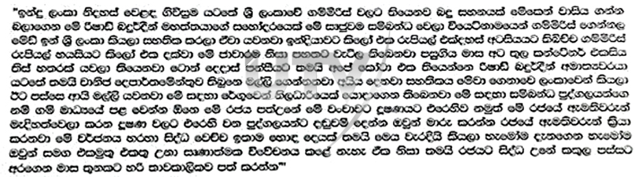 “I act for and write on the instructions of my client Honourable Minister Rishad Bathiudeen of No. 73/1, Galle Road, Colombo 03, the Honourable Minister of Industries and Commerce, Resettlement of Protracted Displaced Persons, and Co-operative Development of Sri Lanka. I am instructed to state that my client is the Leader of All Ceylon Makkal Congress (ACMC) a recognised political party and a Cabinet Minister. He is held in high esteem and dignity by the general public and this has been reflected in him being repeatedly elected by the people of the Wanni District as their Representative in Parliament. I am instructed that on or around 06/02/2019 in the ‘Hiru TV’ channel prime news telecasted by you along with Mr. Lasantha Wickramasinghe, the Secretary of Association of Information Technology Professionals on this date which contains the false and defamatory statements.