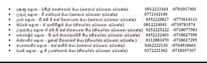 එමෙන් ම ඒ ඒ පළාත්හි වෘත්තීය විෂය ධාරාව සහිත පාසල්වල පවත්නා වෘත්තීය විෂයයන් පිළිබඳ වැඩිදුර තොරතුරු පහත සඳහන් දුරකථන අංක අමතා පළාත් සම්බන්ධීකරණ නිලධාරීන් වෙතින් ද ලබා ගැනීමට අවස්ථාව සලසා ඇත.