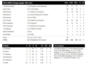 ලකුණු 365 ක ජයග්‍රාහි ඉලක්කයක් හඹා ගිය ශ්‍රී ලංකා කණ්ඩායමට පන්දුවාර 41 යි පන්දු 04 කදී සියළු දෙනා දැවි ලබා ගැනිමට හැකි වුයේ ලකුණූ 249 ක් පමණි.