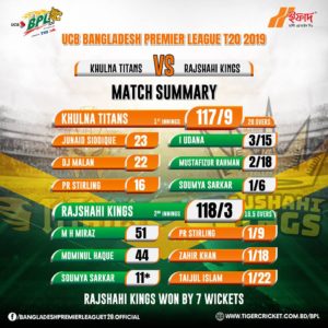 මෙම තරගයේදි කාසියේ වාදිය දිනා පළමුව පන්දුවට පහරදුන් කුල්නා ටයිටන්ස් සිය පන්දුවාර 20 අවසානයේ කඩුලු 09 ක් දැවි ලකුණු 117 ක් ලබා ගත්තේය.