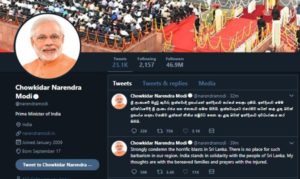 ට්විටර් පණිඩුඩයක් නිකුත් කරමින් ඉන්දියානු අගමැති නරේද්ර මොදි මේ බව ප්රකාශ කළේ ශ්රී ලංකාවේ දේවස්ථාන කිහිපයකට සහ හෝටල් කිහිපයකට එල්ල වූ ප්රහාරයන් තරයේ හෙළා දැකින බවයි.
