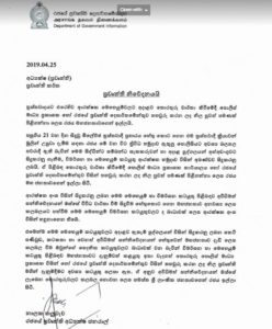 පසුගිය 21 වන දින සිදුවූ මිලේච්ඡ ත්රස්තවාදී ප්රහාරය හේතු කොට ගෙන එම ත්රස්තවාදී ක්රියාවන් මුලින් උපුටා දැමීම සඳහා රජය මේ වන විට ත්රිවිධ හමුදාව ඇතුලු පොලිසියට අවශ්ය බලතල පවරාදී ඇති බැවින් මෙම සිද්ධීන්ට සම්බන්ධ සැකකරුවන් හා අදාළ පුද්ගලයන් අත්අඩංගුවට සිදුකරනු ගැනීම, විමර්ශන හා මෙහෙයුම් කටයුතු ආරක්ෂක හමුදාව විසින් අඛණ්ඩව සිදුකරනු ලබයි. ඒ පිළිබඳ තොරතුරු වාර්තා කිරීමේදී පොලිස් මාධ්ය ප්රකාශක කාර්යාලය හෝ රජයේ ප්රවෘත්ති දෙපාර්තමේන්තුව විසින් තහවුරු කරන ලද නිල පුවත් පමණක් පිළිගන්නා ලෙස රජය මහ ජනතාවගෙන් ඉල්ලා සිටී.