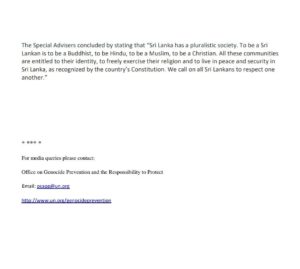 මෙම සිදුවීම් සම්බන්ධයෙන් වගකිව යුත්තන් නීතිය හමුවට පමුණුවා වරදකරුවන් වුවහොත් නීතිය උපරිමයෙන් ක්‍රියාවට නංවන ලෙසටද එක්සත් ජාතීන්ගේ සංවිධානය ශ්‍රී ලංකා රජයට දැනුම් දෙයි.