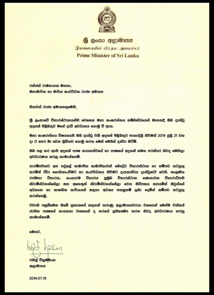 ඒ අනුව 2019 ජූලි 21 වන දිනට පෙර මහා සංඝරතනය ගැන දැක්වු අදහස් සම්බන්ධයෙන් ලිඛිත දැනුවත් කිරීමක් තමන්ට එවන ලෙස දන්වා තිබුණු බවද අගමැතිවරයා මෙම ලිපියේ වැඩිදුරටත් දක්වා තිබේ.