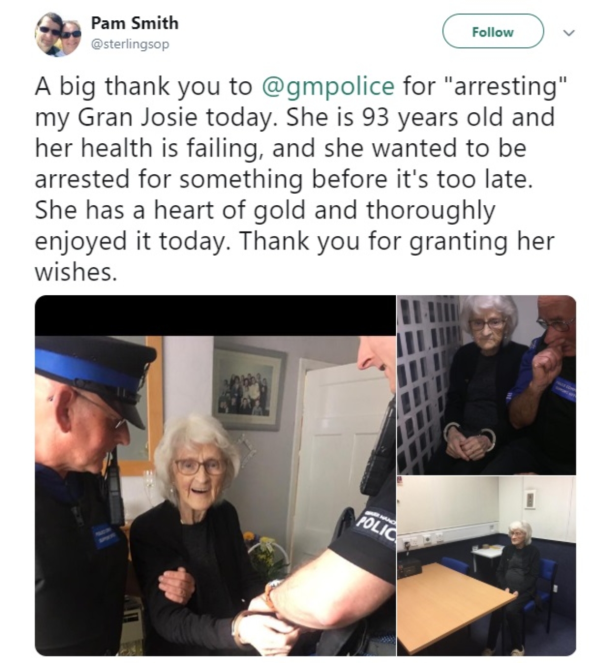 மூதாட்டியின் பேத்தி பாம் ஸ்மித். அதில், “ என் பாட்டியை கைது செய்த கிரேட்டர் மான்செஸ்டர் பொலிஸுக்கு பெரிய நன்றி. என் பாட்டிக்கு 93 வயதாகிறது அவரது உடல்நிலை சற்று மோசமாகியும் வருகிறது. ` தன்னைக் கைது செய்த அனுபவத்தை உணர்ந்ததில்லை என்றும் தன்னைக் கைது செய்வதுதான் கடைசி ஆசை எனவும்’ என்னிடம் தொடர்ந்து கூறிவந்தார். என் பாட்டி தங்கமானவர். அவர் கைது செய்யப்பட்டபோது மிகவும் மகிழ்ச்சியாக இருந்தார். என் பாட்டியின் ஆசையை நிறைவேற்றிய காவலர்களுக்கு நன்றி” என்று கூறியுள்ளார்.