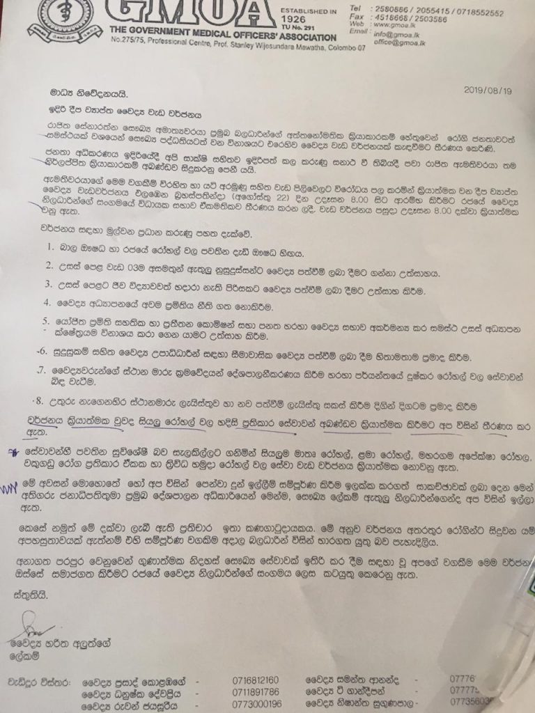ඉල්ලීම් කිහිපයක් මුල්කරගනිමින් එළඹෙන 22 වන බ්‍රහස්පතින්දා දින දිවයින පුරා වෛද්‍ය වර්ජනයක් ක්‍රියාත්මක කරන බව රජයේ වෛද්‍ය නිලධාරීන්ගේ සංගමය නිවේදනයක් නිකුත් කරයි.