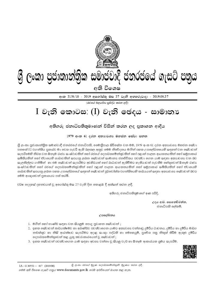 මෙය ජනාධිපති මෛත්රීපාල සිරිසේන මහතා විසින් ඊයේ (27) සිට බල පැවැත්වෙන අතිවිශේෂ ගැසට් නිවේදනයක් නිකුත් කරනු ලැබේ.
