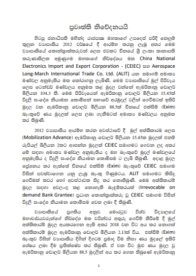 කොළඹ නෙළුම් කුළුණ ඉදිකිරීමේ එහි අත්තිකාරම් ලෙස ඇමරිකානු ඩොලර් මිලියන 15.45 ක මුදලක් ඉදිකිරීම් සමාගමට ගෙවීම සම්බන්ධයෙන් චීනයේ Exim බැංකුව විසින් නිකුත් කරන ලද ලේඛණයක් එවකට විදුලි සංදේශ නියාමන කොමිෂන් සභාවේ හිටපු අධ්‍යක්ෂ ජනරාල් අනූෂ පැල්පිට විසින් ප්‍රසිද්ධියට පත්කර තිබේ.