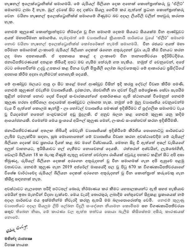 නෙළුම් කුළුන ඉදිකිරීමේදී රුපියල් බිලියන දෙකක මුදලක් අතුරුදන්වීම පිළිබඳව විපක්ෂ නායකවරයා කියා සිටියේ අදටත් නෙළුම් කුළුනේ වැඩකටයුතු සිදුකරන්නේ එම සමාගම බවයි.