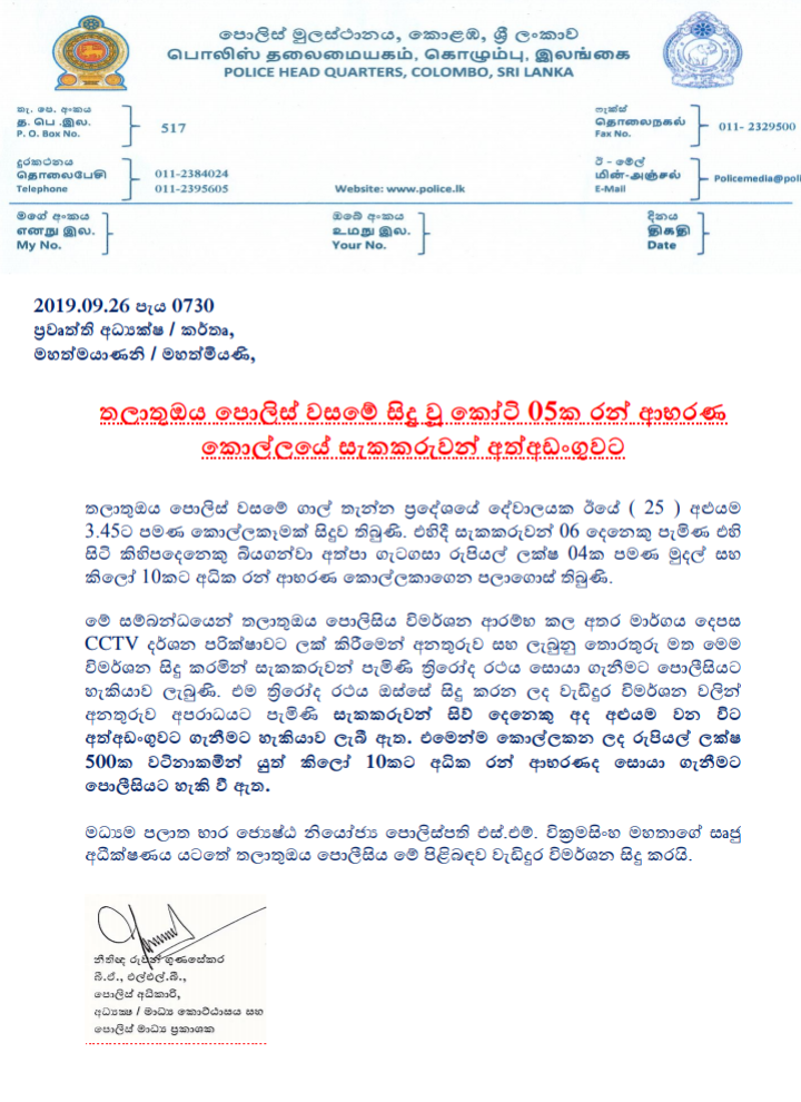 (UTV| කොළඹ) – ගාල්තැන්න ප්රදේශයේ දේවාලයකින් කෝටි 05 කට අධික වටිනා රන් කිලෝග්රෑම් 10 කට අධික ප්රමාණයක් සොරා ගත් සැකකරුවන් සිව් දෙනෙකු අත්අඩංගුවට ගත් බව පොලිසිය පවසයි.