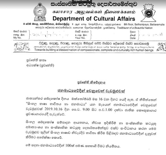 සිංහල භාෂා භාවිතය සහ ජනමාධ්‍ය යන මැයෙන් ජනමාධ්‍යවේදීන් වෙනුවෙන් වූ වැඩමුළුවක් ඔක්තෝම්බර් 16  වැනිදා සංවිධානය කර ඇති බව බව සංස්කෘතික කටයුතු දෙපාර්තමේන්තුව සදහන් කරයි.