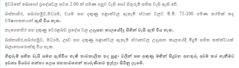 එමෙන්ම ඉදිරි පැය කිහිපය තුල දිවයිනේ බස්නාහිර , සබරගමුව , මධ්යම හා වයඹ පළාත්වලත් ගාල්ල හා මාතර දිස්ත්රික්වලත් ඇතැම් ස්ථාන වල මිලිමීටර් 100 ක පමණ තද වර්ෂාපතනයක් ඇතිවිය හැකි බව කාළගුණ විද්යා දෙපාර්තමේන්තුව නිවේදනය කරයි.
