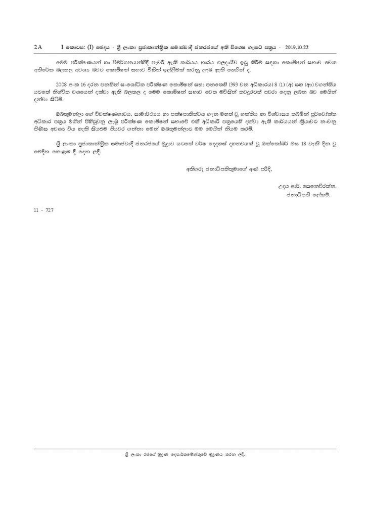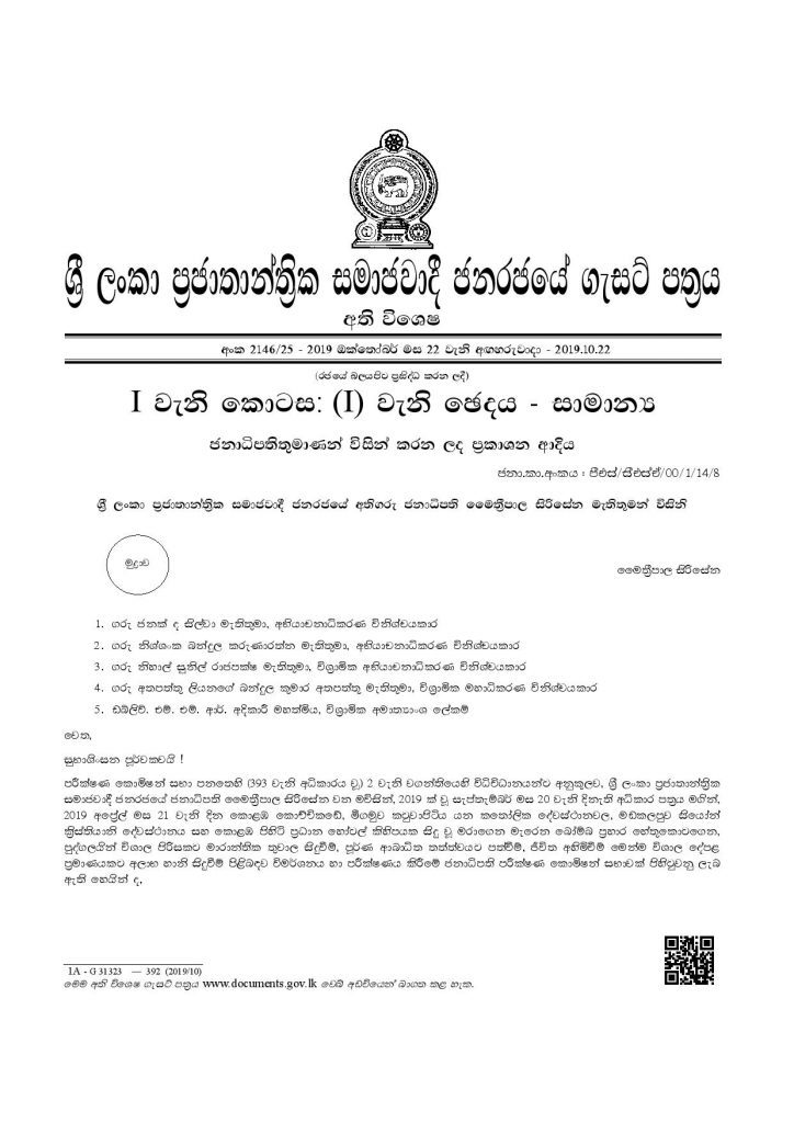 ගැසට් නිවේදනයක් නිකුත් කරමින් ජනධිපතිවරයා මේ බව ප්රකාශ කර ඇත.