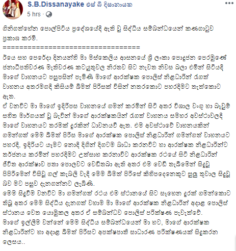 (UTV | කොළඹ) – පාර්ලිමේන්තු මන්ත්රී එස්.බී දිසානායක මහතාගේ ආරක්ෂක අංශ නිළධාරීන් දෙදෙනෙකු විසින් ඊයේ (06) සිදුකළ වෙඩි තැබීම සම්බන්ධයෙන් මන්ත්රීවරයා සිය කණගාටුව ප්රකාශකර තිබේ.