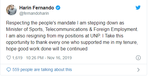 එසේම එක්සත් ජාතික පක්ෂයේ තමන් දරන සියලුම තනතුරුවලින් ද තමන් ඉවත්වන බව ප්‍රකාශ කරයි.