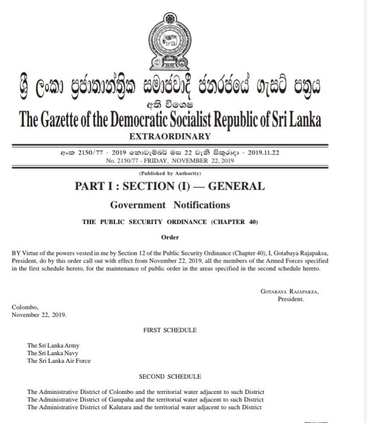 ඒ අනුව කොළඹ, ගම්පහ, කළුතර, මහනුවර, මාතලේ, යාපනය, වව්නියාව ඇතුළු පරිපාලන දිස්ත්රික්ක 25 හේම ආරක්ෂාව සඳහා ත්රිවිධ හමුදා සාමාජිකයින් යෙදවීමට හැකියාව ලැබේ.