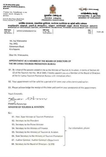 මෙම පත්වීම සිදුකරනු ලැබුවේ සංචාරක සංවර්ධන හා ගුවන්සේවා අමාත්‍ය ප්‍රසන්න රණතුංග විසින්ය.