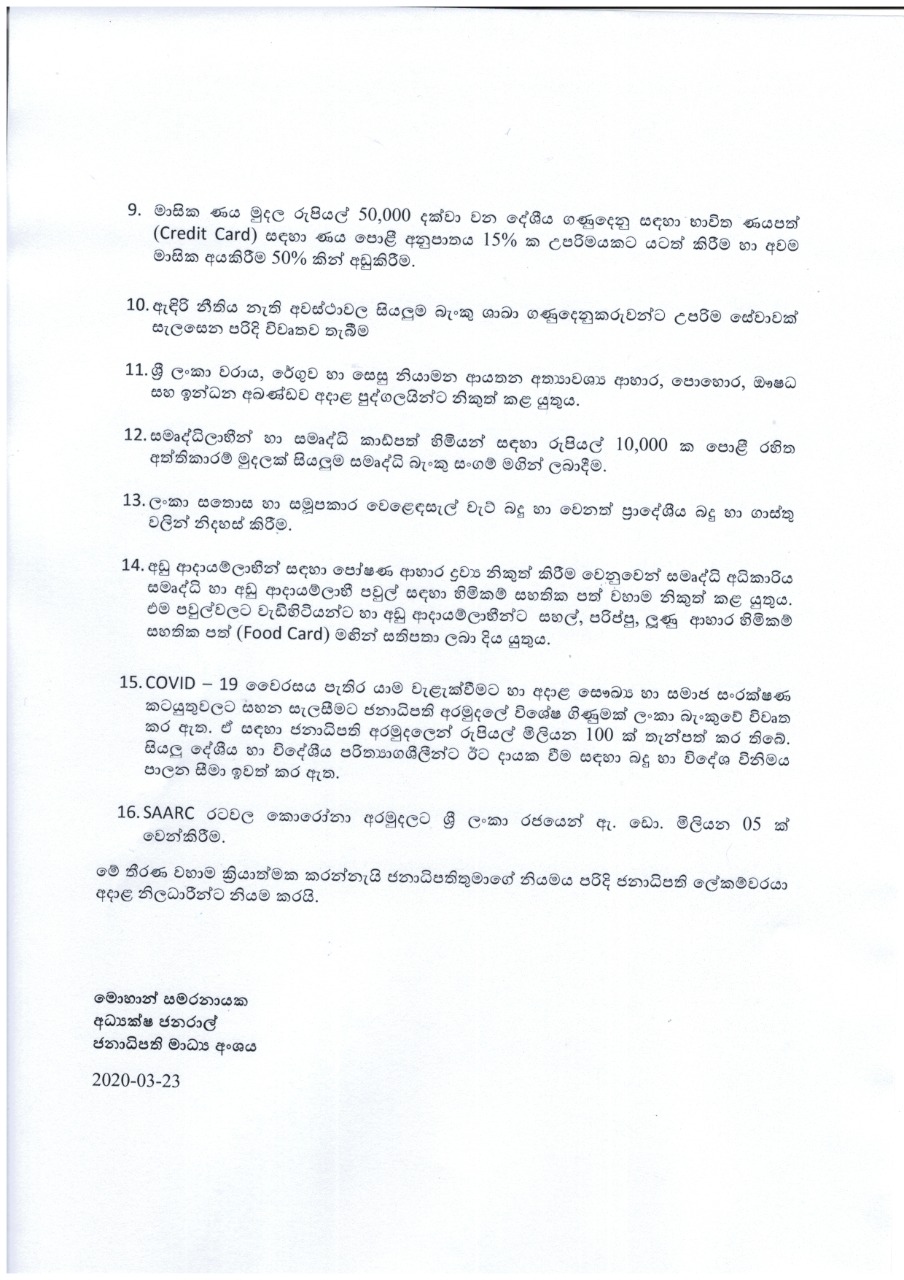 මේ සහන ජනතාවට ලබාදීමට පියවර ගන්නැයි ශ්රී ලංකා මහ බැංකුවේ අධිපති, සියලුම අමාත්යංශ ලේකම්වරුන්, පළාත් සභා ප්රධාන ලේකම්වරුන් සහ සියලුම බැංකු, මූල්ය ආයතන හා කල්බදු ආයතන ප්රධානීන් වෙත නියෝග කර තිබේ.