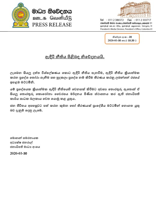 අදාළ නිවේදනයෙන් ජනාධිපති මාධ්ය අංශය පෙන්වා දෙන්නේ ලැබෙන සියලු දත්ත විශ්ලේෂනය කර ඇඳිරි නීතිය පැනවීම, එය ක්රියාත්මක කරන ප්රදේශ තෝරාගැනීම සහ හුදකලා ප්රදේශ නම් කිරීම සම්බන්ධයෙන් තීරණය කරනු ලබන්නේ රජයේ ඉහළ මට්ටමින් බවයි.