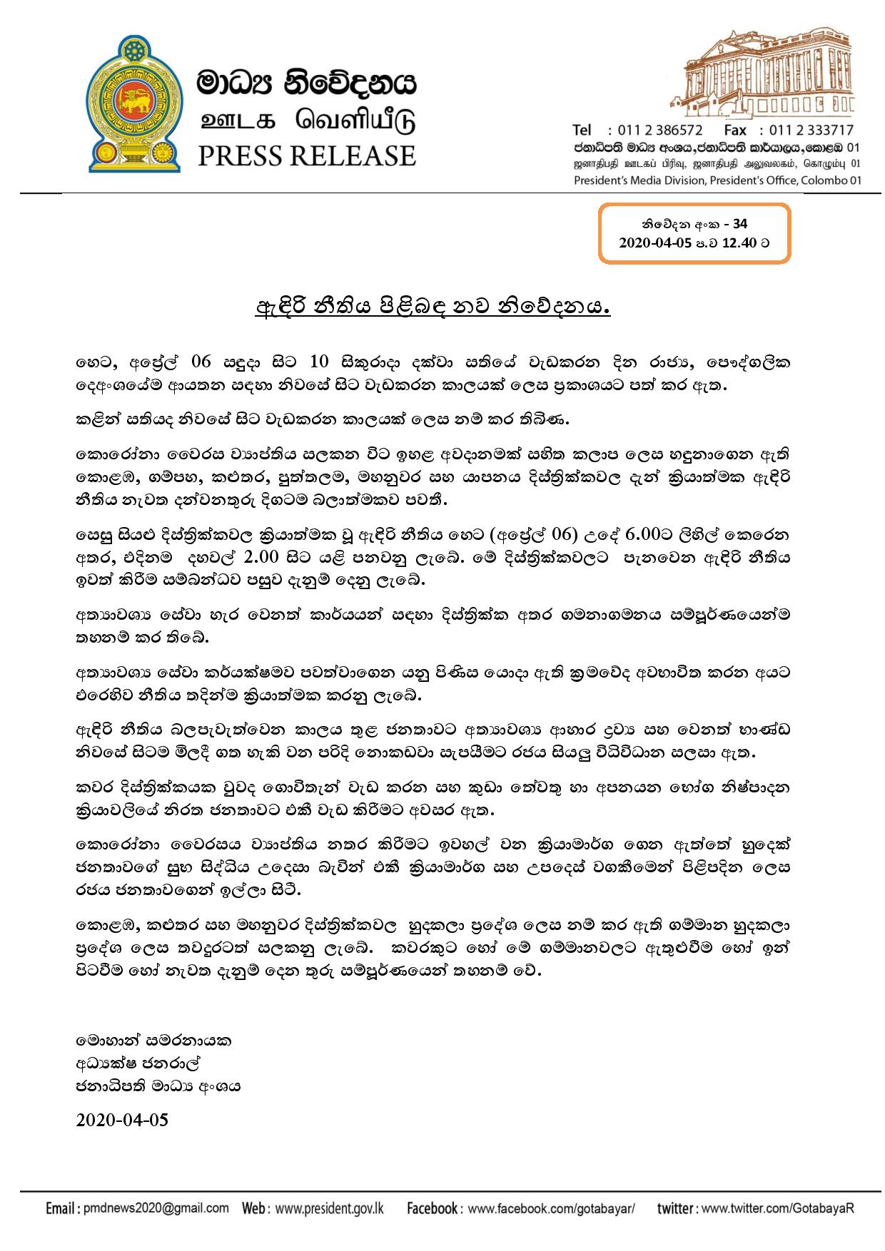(UTV | කොළඹ) – අප්රේල් 06 සඳුදා සිට 10 සිකුරාදා දක්වා සතියේ වැඩකරන දින රාජ්ය, පෞද්ගලික දෙඅංශයේම ආයතන සඳහා නිවසේ සිට වැඩකරන කාලයක් ලෙස ප්රකාශයට පත් කර ඇත.