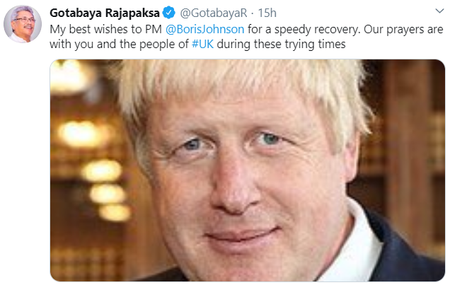 (UTV | බ්රිතාන්ය) – කොවිඩ් 19 ආසාදනය වීමෙන් වී ලන්ඩන් රෝහලේ දැඩි සත්කාර ඒකකයේ ප්රතිකාර ලබන බ්රිතාන්ය අග්රාමාත්ය බොරිස් ජොන්සන් ට ජනාධිපති ගෝඨාභය රාජපක්ෂ ඉක්මන් සුවය ප්රාර්ථනා කර ඇත.