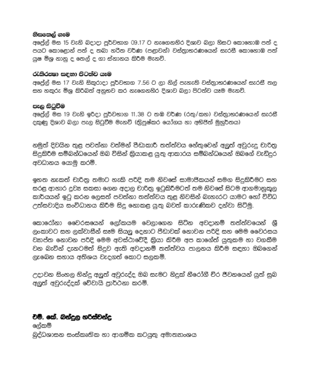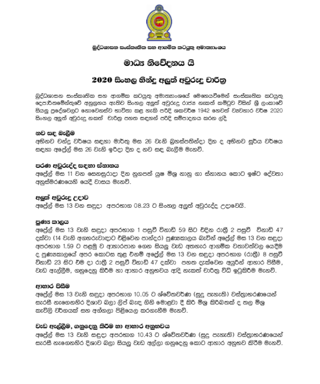 (UTV | කොළඹ) – 2020 සිංහල හින්දු අලුත් අවුරුදු චාරිත්ර පිලිබඳ බුද්ධශාසන සංස්කෘතික සහ ආගමික කටයුතු අමාත්යාංශයේ ලේකම් එම්.කේ බන්දුල හරිස්චන්ද්ර විසින් නිවේදනයක් නිකුත් කරනු ලැබීය.