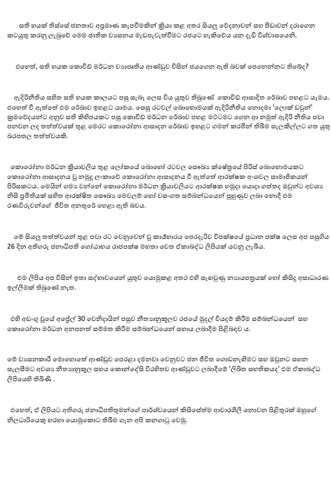 එහි මහ ලේකම් හිටපු පාර්ලිමේන්තු මන්ත්රී රංජිත් මද්දුමබණ්ඩාර මහතා කියා සිටියේ මේ මොහොතේ කළ යුතු ප්රායෝගික ක්රියාවලිය වන්නේ හිටපු කථානායකවරයාගේ ප්රධානත්වයෙන් පාර්ලිමේන්තුව කැදවීම බව වගකීමෙන් යුතුව නැවත අවධාරණය කරන බවයි.