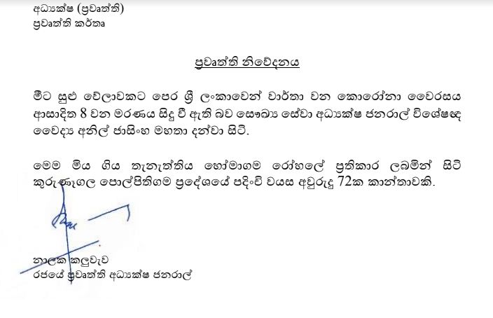 මෙරට 8 වන කොරෝනා මරණයත් වාර්තා වෙයි