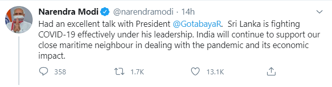 (UTV | කොළඹ) – ගෝඨාභය රාජපක්ෂ මහතාගේ නායකත්වය යටතේ ශ්රී ලංකාව සාර්ථකව කොරෝනා වසංගතයට එරෙහිව සටන් කරමින් සිටින බව ඉන්දීය අග්රාමාත්ය නරේන්ද්ර මෝදි මහතා පවසයි.