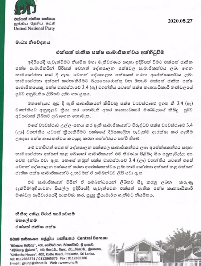 (UTV | කොළඹ) – සමගි ජන බලවේගය සමඟ නාමයෝජනා අත්සන් කළ එක්සත් ජාතික පක්ෂ සාමාජිකයන්ගේ පක්ෂ සාමාජිකත්වය අත්හිටුවීමට එක්සත් ජාතික පක්ෂ නායකත්වය තීරණය කර ඇත.