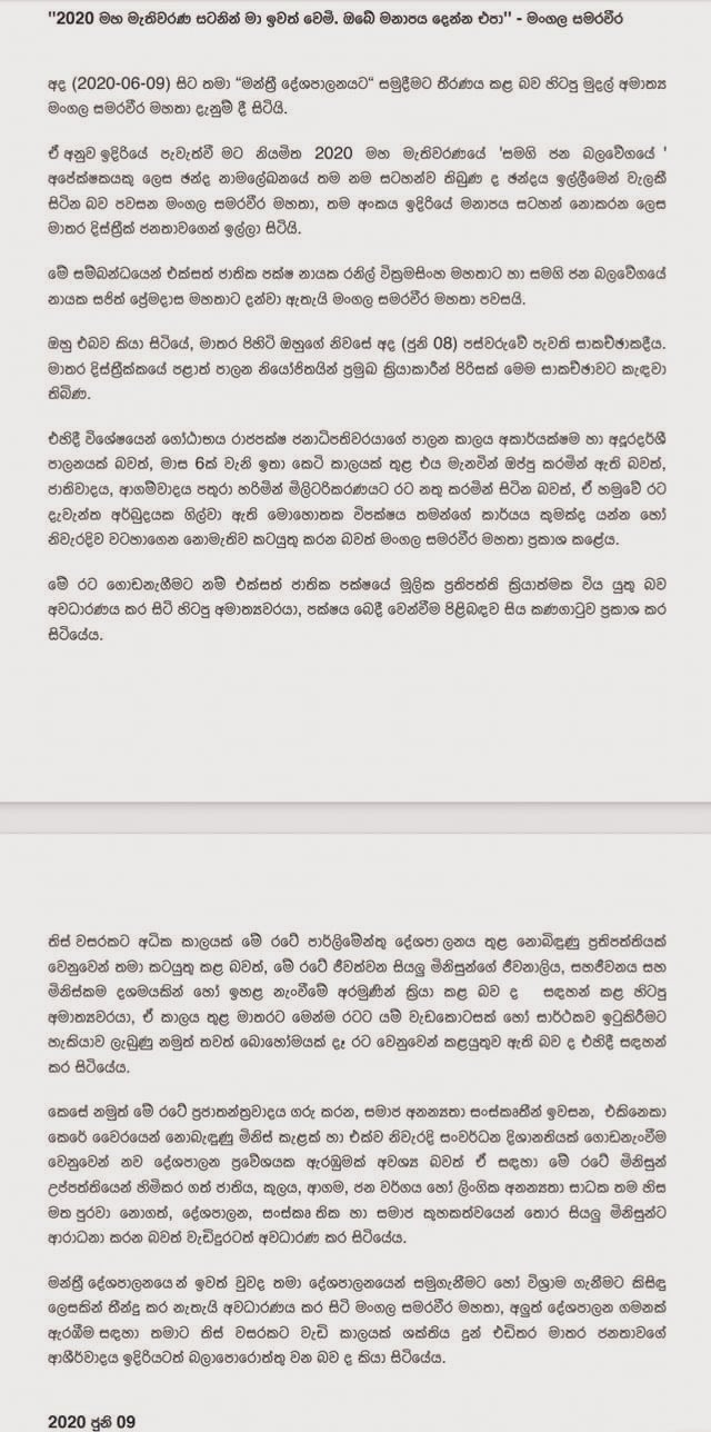 (UTV | කොළඹ) – මෙවර මහමැතිවරණයට තමන් තරඟ නොකරන බව හිටපු පාර්ලිමේන්තු මන්ත්රී මංගල සමරවීර නිවේදනයක් නිකුත් කරමින් ප්රකාශ කර සිටියි.