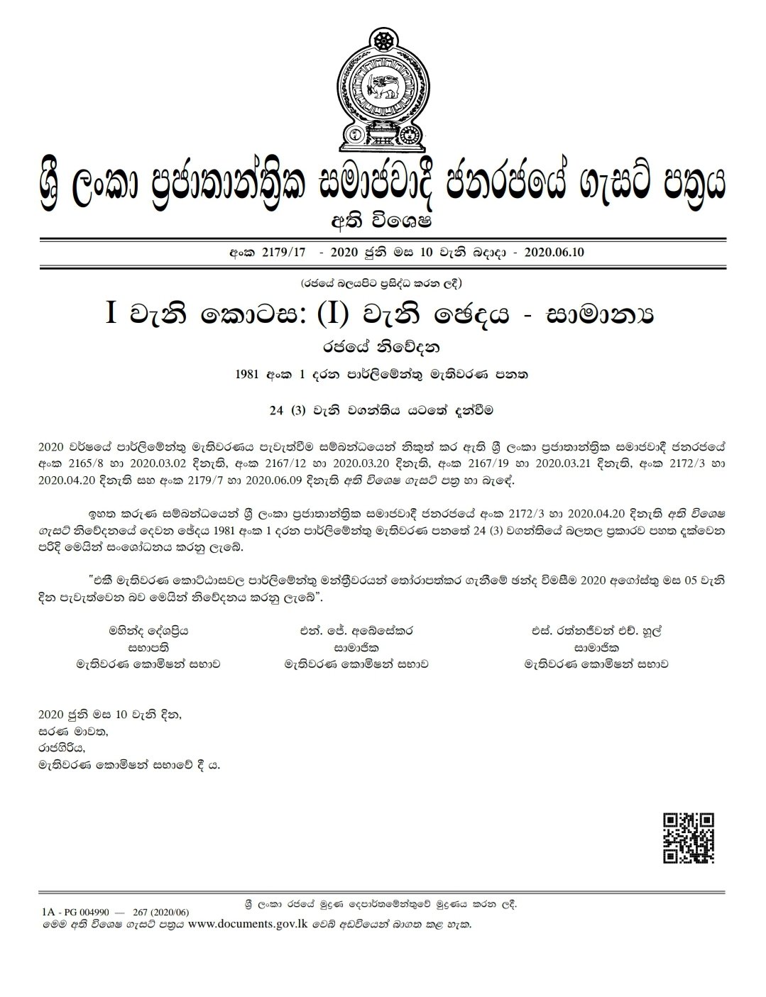 (UTV | කොළඹ) – අගෝස්තු 05 වනදා මහ මැතිවරණය පැවැත්වීමට අදාළ අතිවිශේෂ ගැසට් නිවේදනය මේ වනවිට නිකුත් කර ඇත.