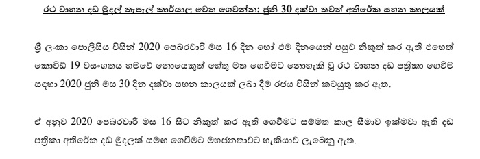 මේ අනුව පොලිසිය විසින් පසුගිය පෙබරවාරි මස 16 වන දින සිට නිකුත් කර ඇති එහෙත් ගෙවීමට සම්මත කාල සීමාව ඉක්මවා ඇති දඩ පත්රිකා අතිරේක දඩ මුදලක් සමග ගෙවීමට මහජනතාවට අවස්ථාව දී ඇති බව තැපැල්පති රංජිත් ආරියරත්න මහතා නිකුත් කළ නිවේදනයක දැක්වෙයි.