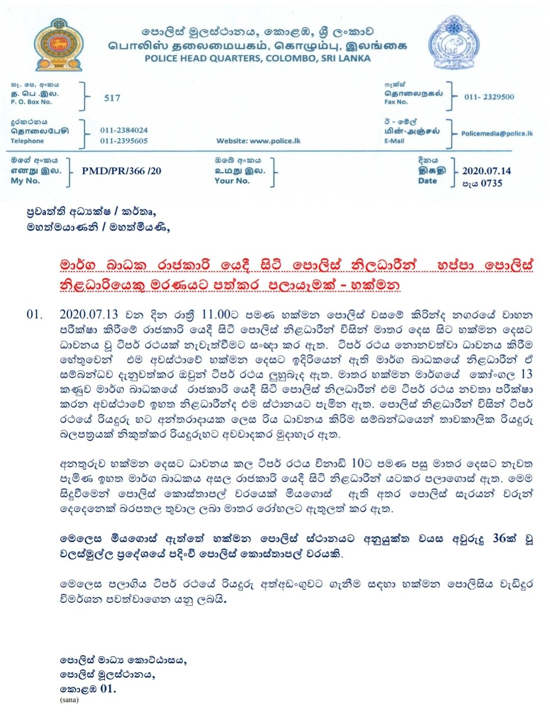 මෙම අනතුරෙන් කොස්තාපල්වරයා මියගොස් ඇති අතර ඔහු 36 හැවිරිදි වියේ පසුවූ අයෙක්.
