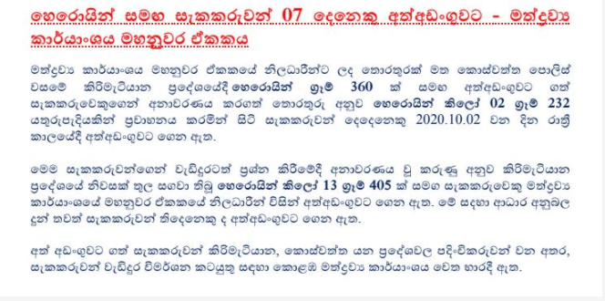 (UTV | මාරවිල) – රුපියල් කෝටි 16කට ආසන්න වටිනාකමින් යුත් හෙරොයින් කිලෝ 15 යි ග්රෑම් 997 ක් සමග සැකකරුවන් 7 දෙනෙකු මාරවිල කොස්වත්ත සහ දංකොටුව ප්රදේශවලදී පොලිසිය විසින් අත්අඩංගුවට ගෙන ඇත.