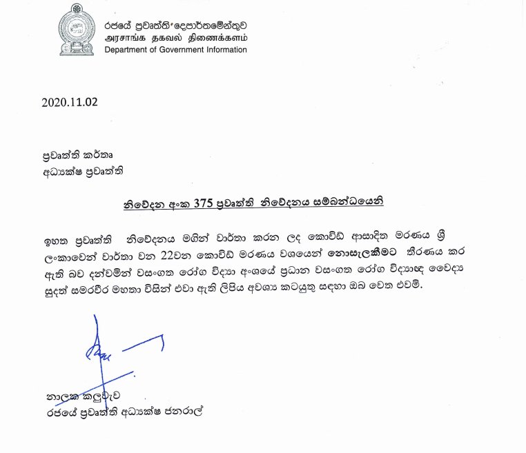 මෙම මරණයට කොරෝනා වෛරසයේ දායකත්වයක් නොමැති බව වසංගත රෝග විද්යා අංශයේ ප්රධානී වෛද්ය සුදත් සමරවීර මහතා කියා සිටියේය.