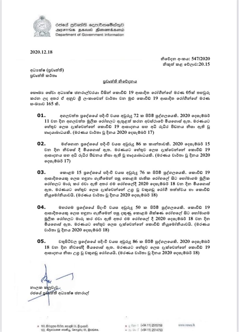 තවත් කොරෝනා මරණ පහක් [RELEASE]