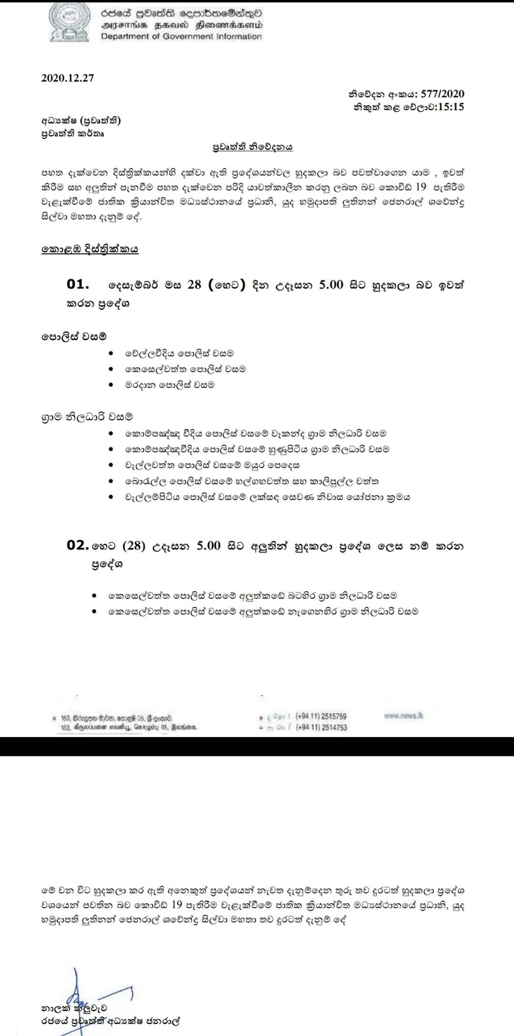 කොළඹ ප්‍රදේශ කීපයක හුදෙකලාභාවය හෙට උදේ 5 ට ඉවත් කෙරේ [RELEASE]