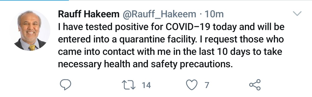 (UTV | කොළඹ) – තමන්ට කොවිඩ් 19 වෛරසය වැළඳී ඇතැයි තහවුරු වූ බව පාර්ලිමේන්තු මන්ත්‍රී රවුෆ් හකීම් මහතා ට්විටර් සටහනක් තබමින් සඳහන් කර සිටියි.