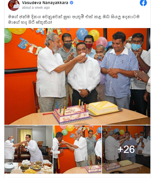 ඇමැතිවරයාගේ ෆේස්බුක් ගිණුමේ පළකර ඇති ඡායාරූපවලට අනුව තමා වෙනුවෙන් නිර්මාණය කළ කේක් කපා රාජ්ය ඇමැති සනත් නිශාන්තට සහ එහි සිටි පිරිසට ඇමැතිවරයා විසින් කේක් කවන ආකාරයද දක්වා තිබේ.