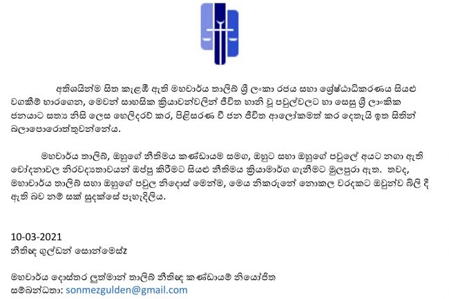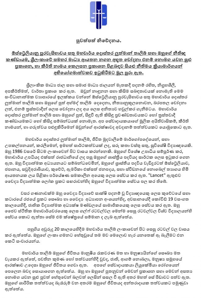 (UTV | කොළඹ) – ඕස්ට්රේලියානු පුරවැසිභාවය සතු මහාචාර්ය දොස්තර ලුත්මාන් තාලිබ් සහ ඔහුගේ නීතිඥ කණ්ඩායම මෙරට ඇතැම් මාධ්ය ආයතන නගන අභූත චෝදනා , එනම් නොමග යවන සුළු ප්රකාශන , හා කීර්තති නාමය කෙලෙසන ප්රකාශන පිළිබඳ සියලු නීතිමය ක්රියාමාර්ගයන් අභියෝගාත්මකය ඉටුකිරීමට මුල පුරා ඇත.