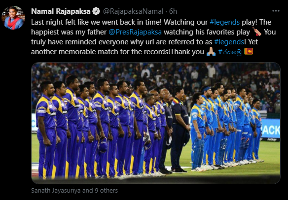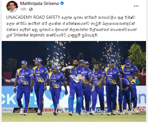මේ අතර , Road Safty World Series තරඟාවලියේ අනු ශූරතාවය හිමිකරගත් ශ්රී ලංකා ප්රවීණයන්ගේ පිලට ක්රීඩා අමාත්යවරයා මෙන්ම හිටපු ජනාධිපතිවරයා ද සුභ පැතුම් එක්කර තිබූ අයුරු දක්නට ලැබිණි.