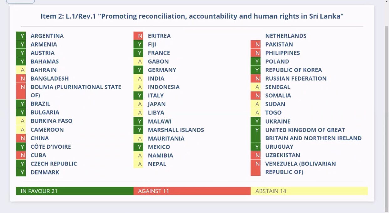(UTV | කොළඹ) – ජිනීවා මානව හිමිකම් මණ්ඩලයේ 46 වන සැසිවාරයට ඉදිරිපත් කර ඇති ශ්රී ලංකාව පිලිබඳව යෝජනාව සම්බන්ධයෙන් වන ජන්ද විමසීම මිට සුළු මොහොතකට පෙර සම්මත විය.