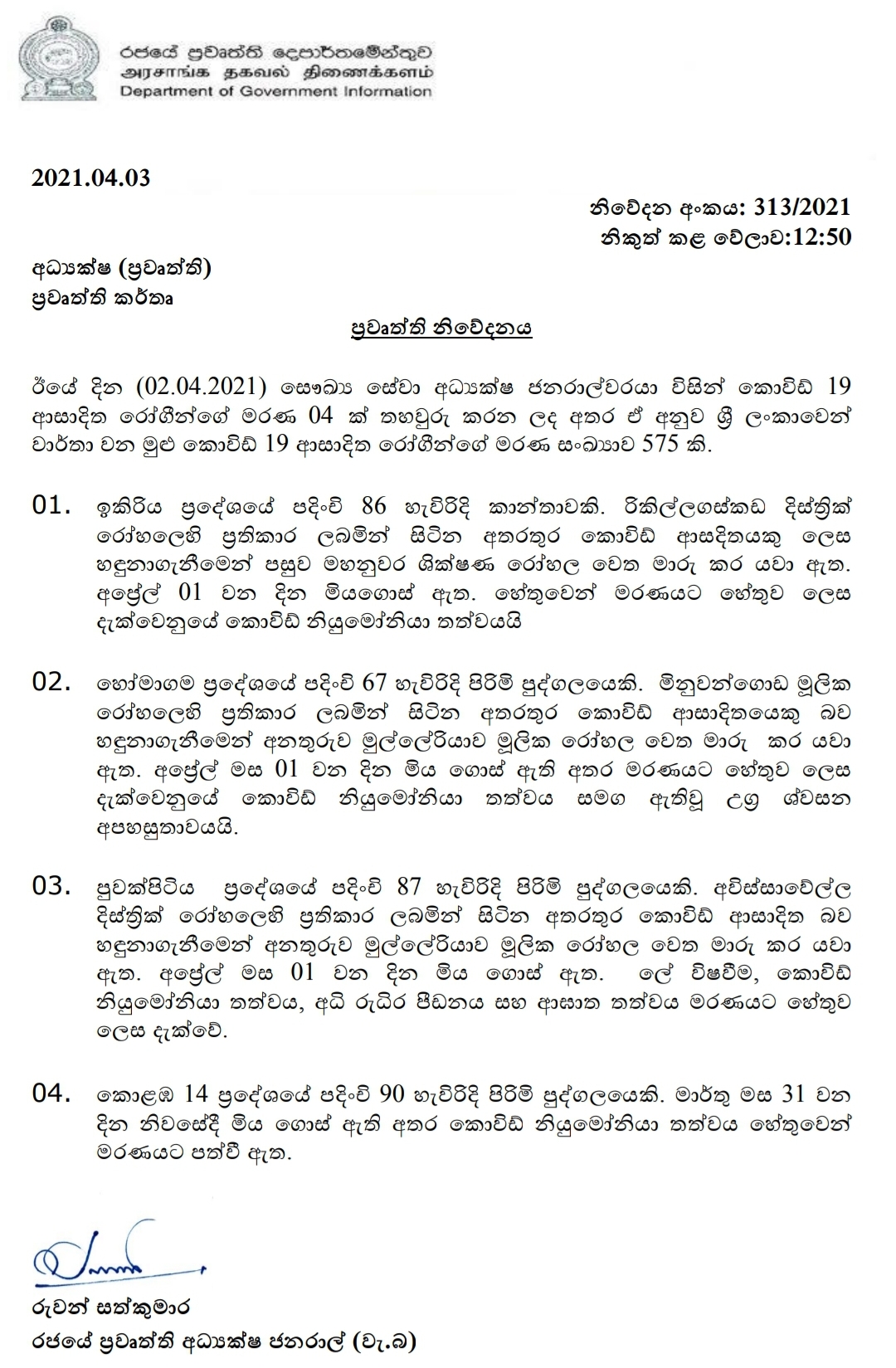 (UTV | කොළඹ) – තවත් කොවිඩ් මරණ 04 ක් වාර්තා වී ඇත. ඒ අනුව, මෙරටින් මේ දක්වා වාර්තා වී ඇති කොවිඩ් මරණ ගණන 575 ක් දක්වා ඉහළ ගොස් තිබේ.