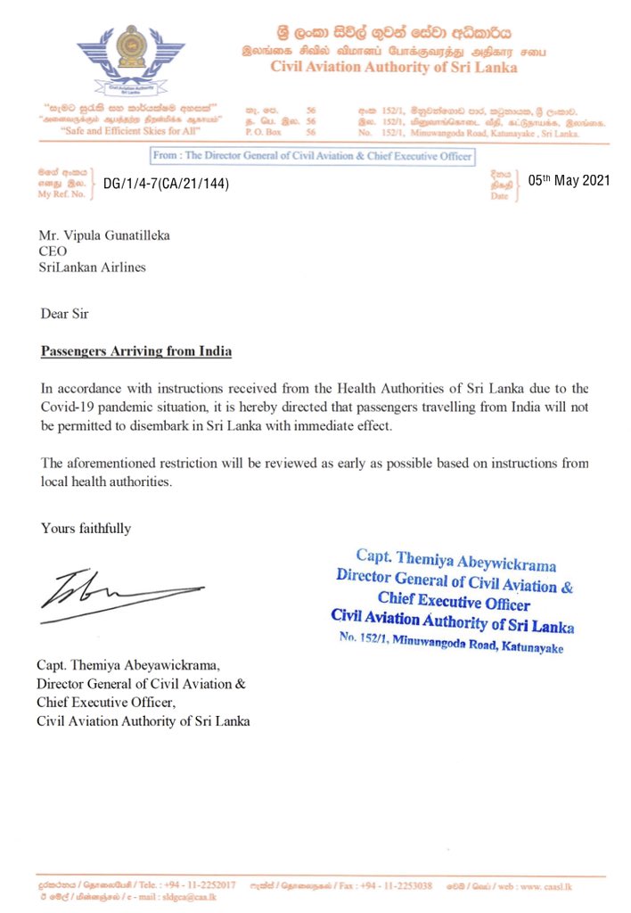 සිවිල් ගුවන් සේවා අධිකාරිය නිවේදනයක් නිකුත් කරමින් කියා සිටියේ පසුගිය කාලවකවානුවේ සිට ඉන්දියාවේ කොරෝනා ආසාදිතයින් සීග්රයෙන් ඉහළ යාමත් සමඟ ගුවන් මාර්ගයෙන් මෙන්ම ධීවර යාත්රා හරහා ද ඉන්දීය ජාතිකයින් මෙරටට පැමිණෙන බවයි.