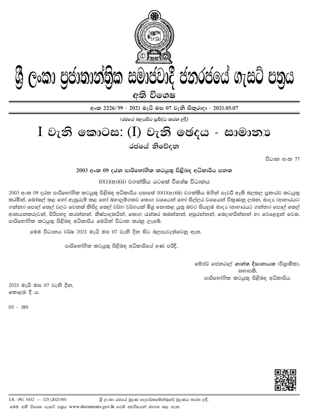 මේ අනුව ආනයනකරුවන්, පිරිපහදුකරන්නන්, නිෂ්පාදකයින්, තොග රැස්කර තබන්නන්, අසුරන්නන්, බෙදාහරින්නන් සහ වෙළඳුන් වෙත මෙම විධානය නිකුත් කෙරෙනු ඇත.