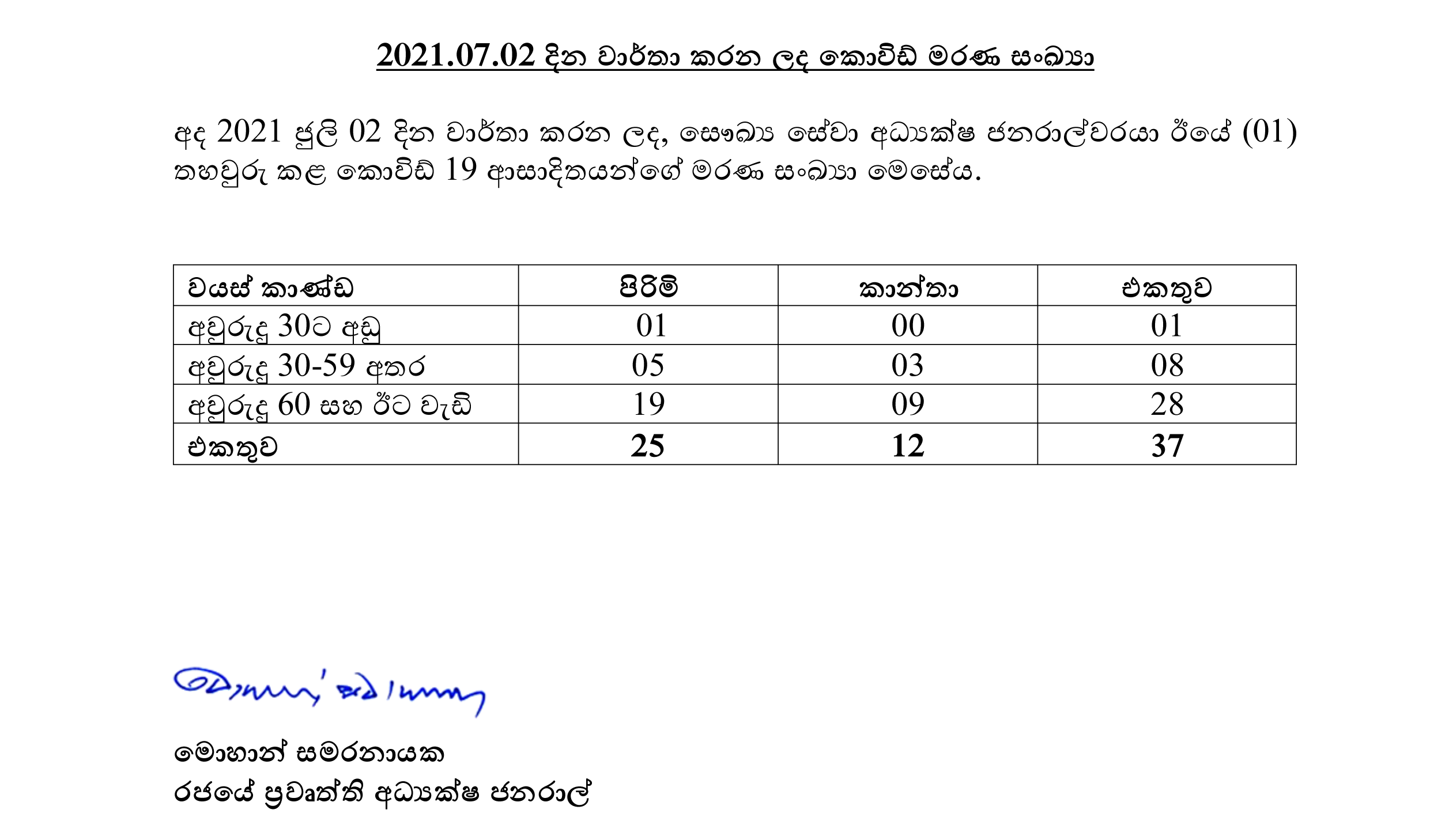 (UTV | කොළඹ) – සෞඛය සේවා අධ්‍යක්ෂක ජනරාල්වරයා විසින් ඊයේ (01) දිනයේ සිදුවූ කොවිඩ් මරණ 37ක් තහවුරු කර තිබේ.
