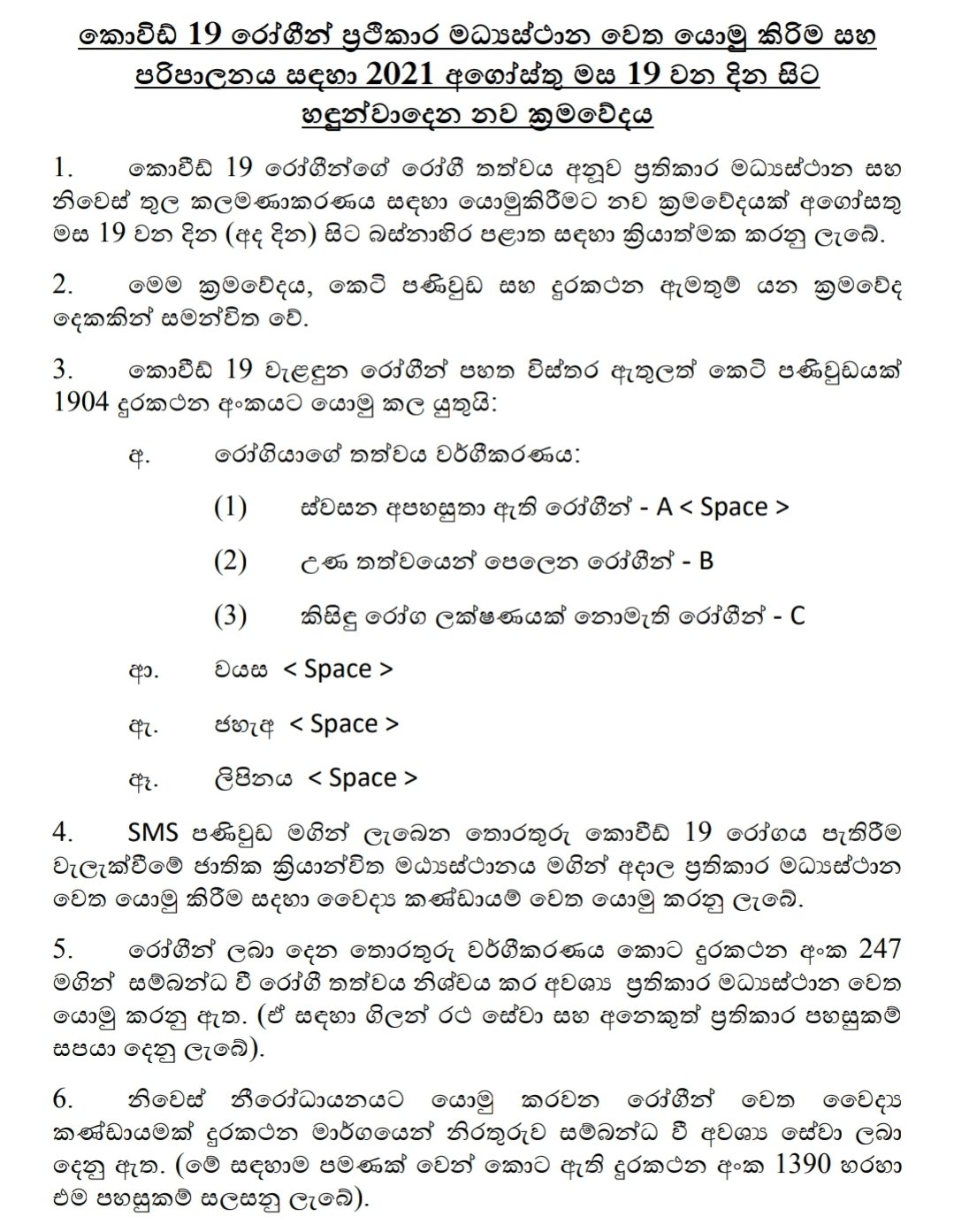 ඒ අනුව, එම කොරෝනා ආසාදිතයා ශ්වසන අපහසුතා ඇති රෝගියෙක් නම් A අකුර සටහන් කර වයස, හැඳුනුම් පත් අංකය සහ ලිපිනය සඳහන් කර 1904 අංකයට කෙටි පණිවුඩයක් යොමු කළ යුතු අතර එම රෝගියා උණ රෝගී තත්ත්වයක පෙළෙන කෙනෙකු නම් B අක්ෂරය ද කිසිදු රෝග ලක්ෂණයක් නැති කෙනෙකු නම් C අක්ෂරය ද සටහන් කර අදාළ දුරකතන අංකයට යොමු කළ යුතුය.