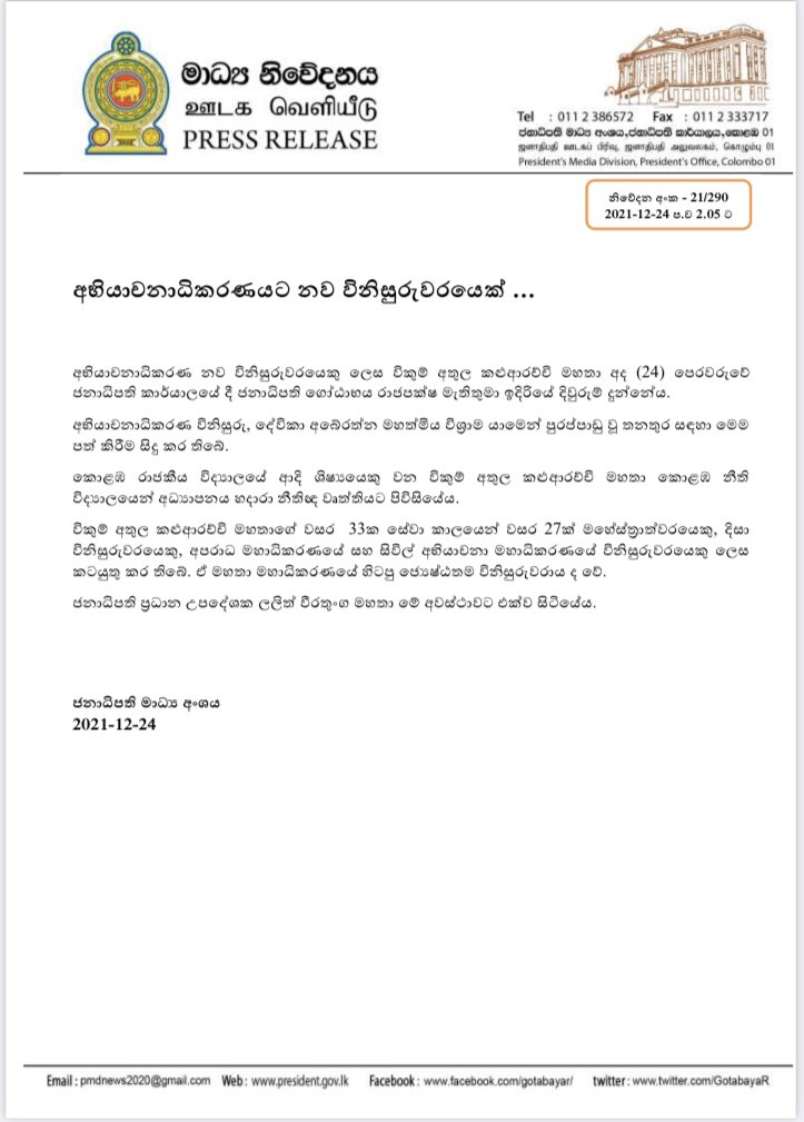 (UTV | කොළඹ) – අභියාචනාධිකරණයේ නව විනිසුරුවරයෙකු ලෙස විකුම් කළුආරච්චි ජනපති ඉදිරියේ අද(24)දින දිවුරුම් දෙනු ලැබුවා.