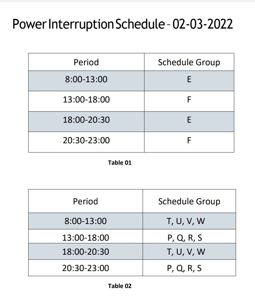 විදුලි කප්පාදුව සිදුවන කාල සටහන පහතින් දැක්වේ.